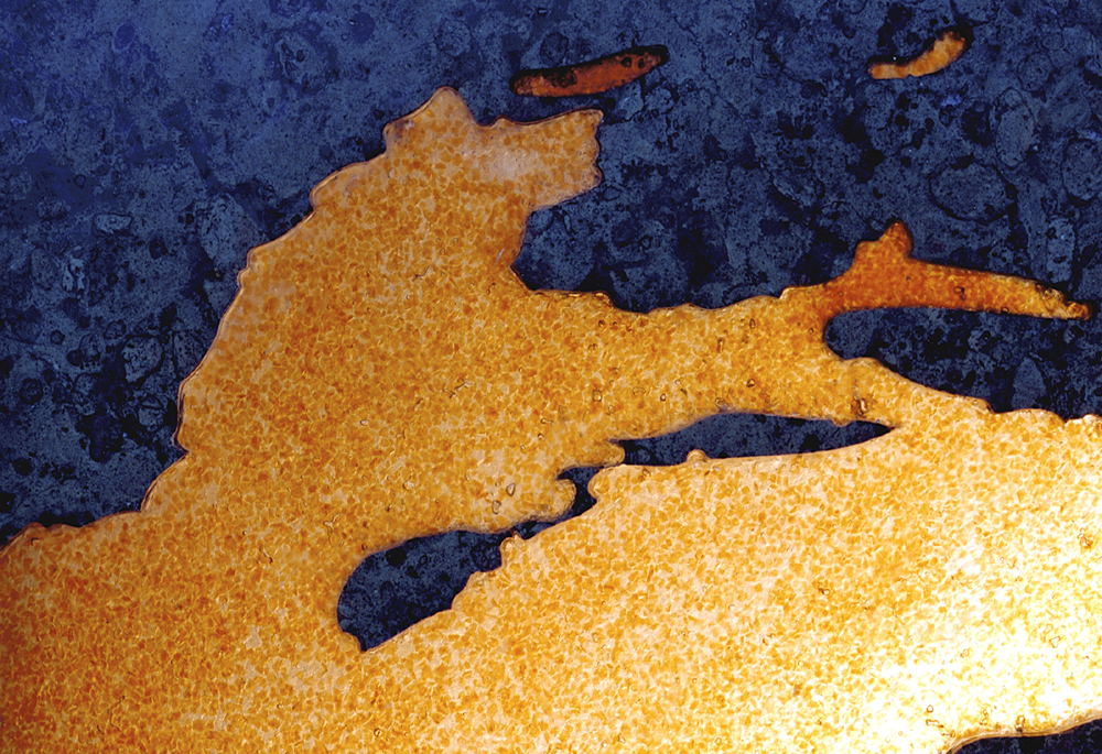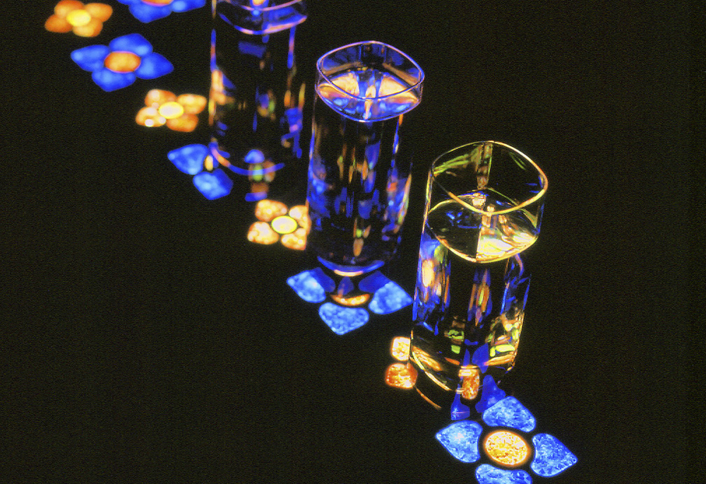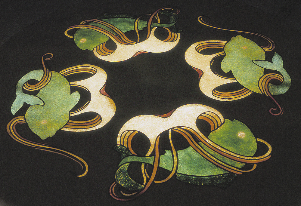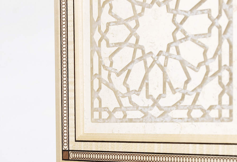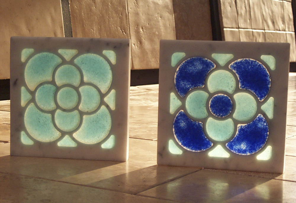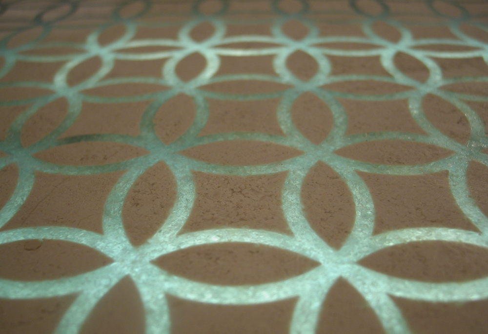 Panels of marble are waterjet cut and inlaid with a glass compound. The inlaid design is translucent and consequently can be backlit to stunning effect. Never before have these two beautiful materials, marble and glass, been combined in this way.