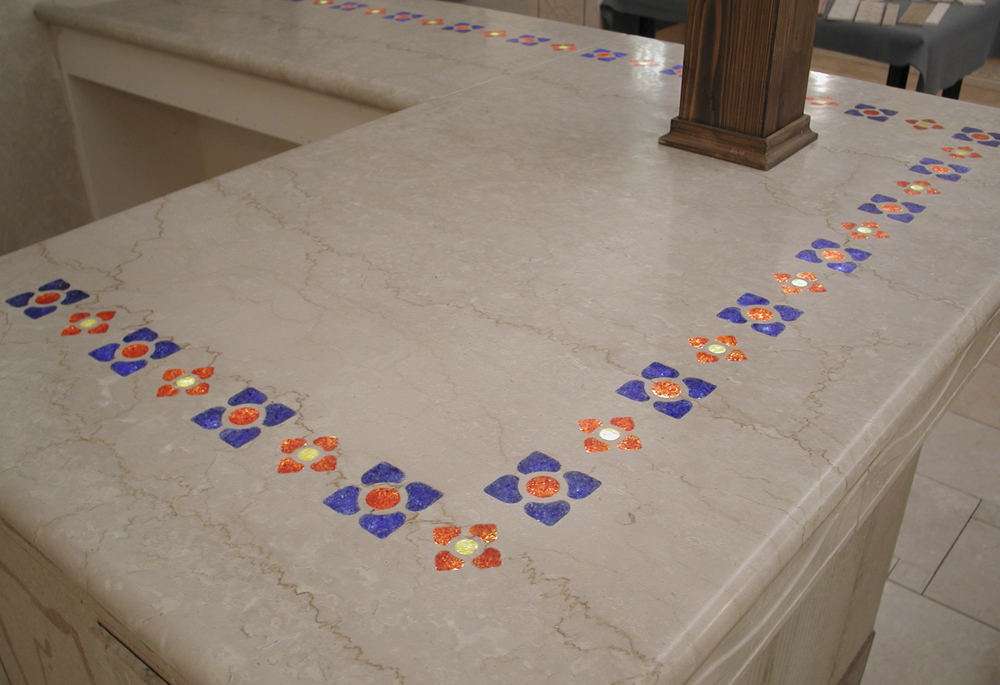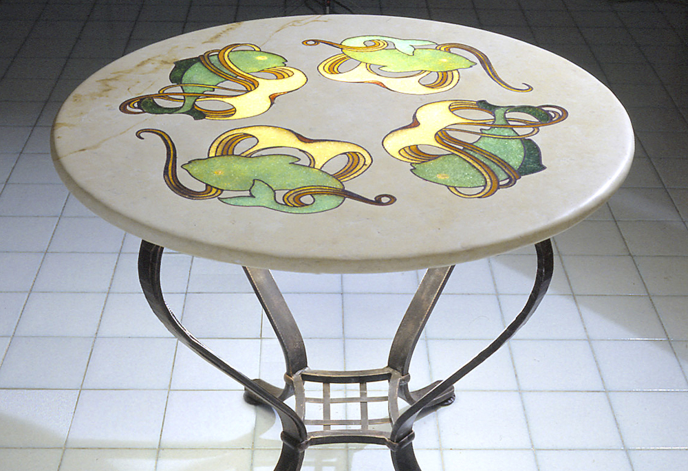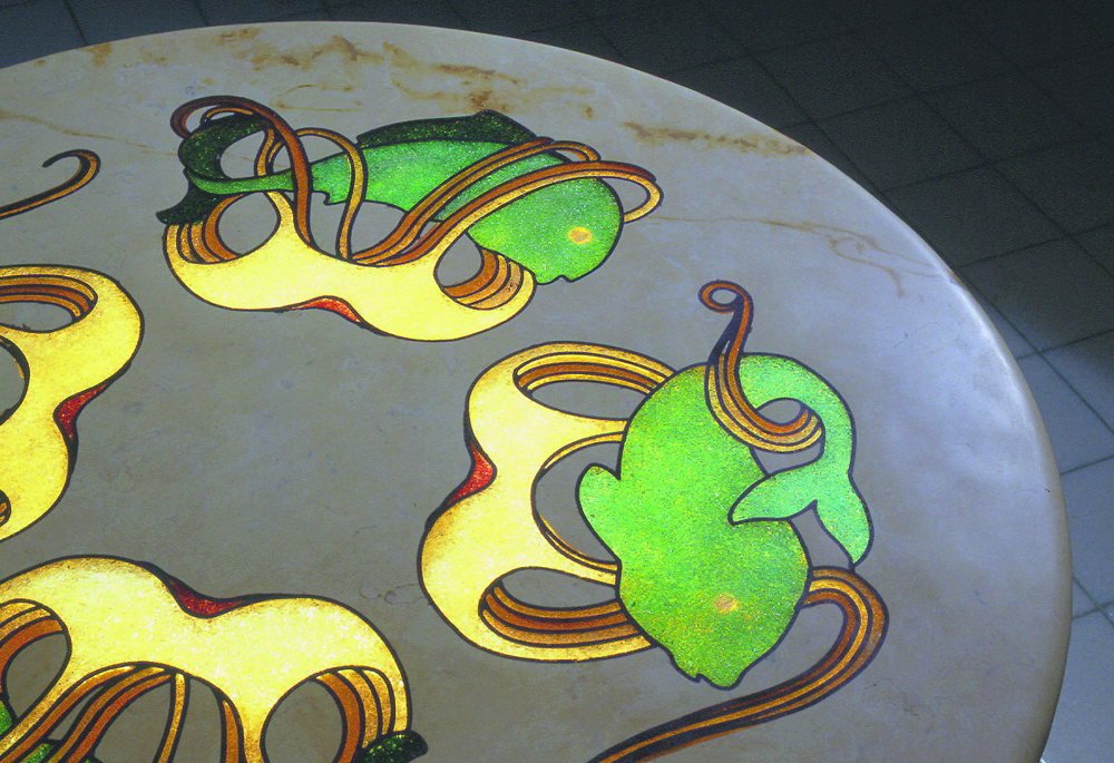 Glass Inlaid Marble was originated by designer Ben Galloway after a visit to Venice and the glass-blowing island of Murano in 2000.